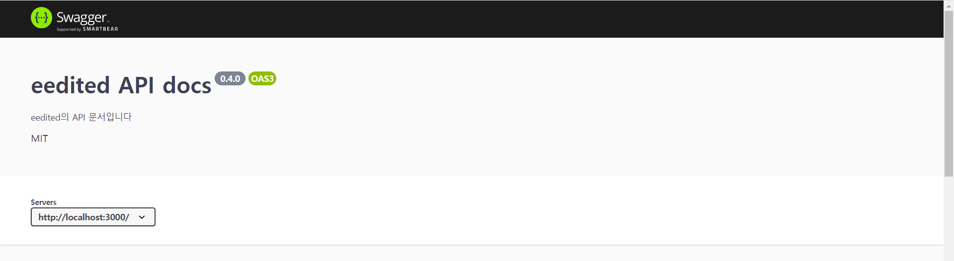openapi: '3.0.0' info: version: 0.4.0 title: eedited API docs description: eedited의 API 문서입니다 license: name: MIT servers: - url: http://localhost:3000/ paths: components:이 상태에서 npm run dev를 하면, swagger.yaml파일에 똑같은 내용이 작성되면서 서버가 실행되는것을 확인 할 수 있다.
