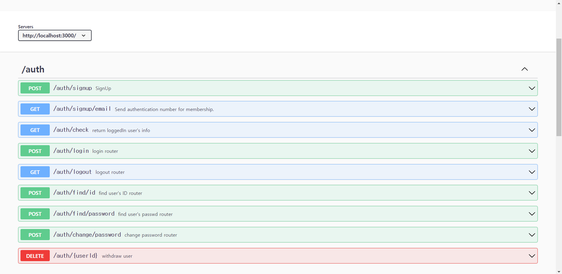 잘 작성되었으면 localhost:3000/api-docs에 접속 시 다음과 같은 화면이 나타난다.